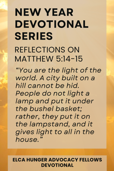 For me, the light of Christ led me to become an ELCA Hunger Advocacy Fellow. In my work as a fellow, I am preparing to help other California Lutherans advocate in the halls of power at their state legislators’ offices. As advocates, we do God’s work when we play a role in shining the light of truth upon the wrongs and injustices in our state, nation and global community. Although it is one of the things the Lutheran Office of Public Policy-California does, shining our light can be done in more ways than just a Lutheran Lobby Day at our state capitol.