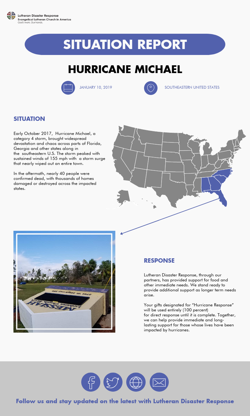 We invite you to stand with communities impacted by Hurricane Michael and other hurricanes. Your gifts to Hurricane Relief ensure that our church will be able to provide help and hope for those affected by these disasters for years to come.