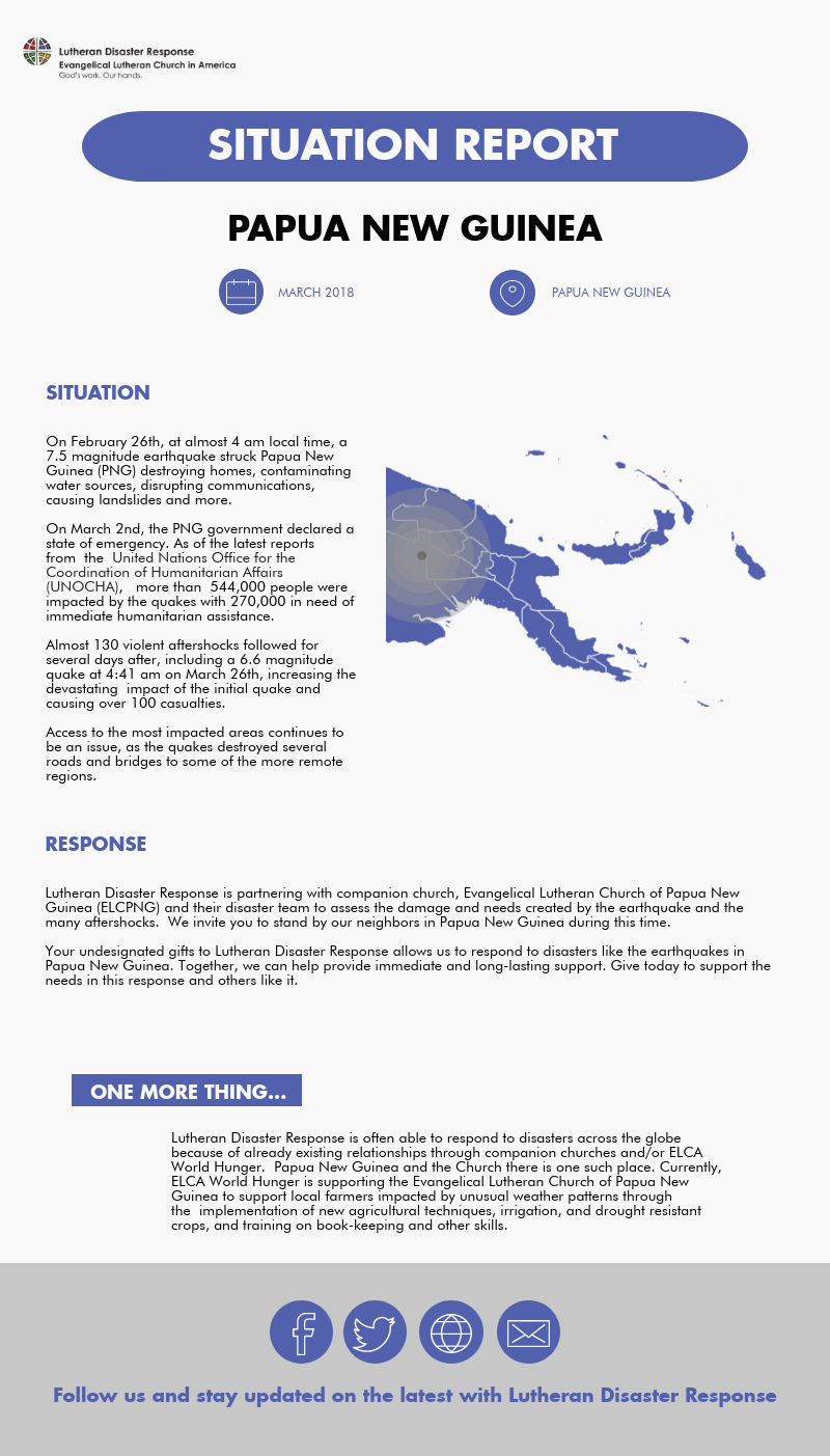 Thanks to generous, undesignated donations, Lutheran Disaster Response is able to respond quickly and effectively to disasters around the globe, including the earthquakes in Papua New Guinea. Your gifts to Lutheran Disaster Response will be used where there is the greatest need.